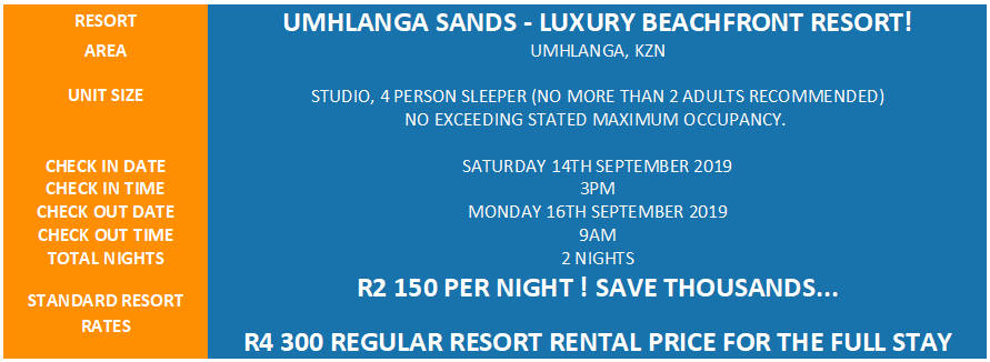 LUXURY BEACH ESCAPE! R4300 VALUE!!! UMHLANGA SANDS 4 SLEEPER 14-09 > 16-09 (2 NIGHTS) LUXURY BEACH ESCAPE! R4300 VALUE!!! UMHLANGA SANDS 4 SLEEPER 14-09 > 16-09 (2 NIGHTS) LUXURY BEACH ESCAPE! R4300 VALUE!!! UMHLANGA SANDS 4 SLEEPER 14-09 > 16-09 (2 NIGHTS) LUXURY BEACH ESCAPE! R4300 VALUE!!! UMHLANGA SANDS 4 SLEEPER 14-09 > 16-09 (2 NIGHTS) LUXURY BEACH ESCAPE! R4300 VALUE!!! UMHLANGA SANDS 4 SLEEPER 14-09 > 16-09 (2 NIGHTS)