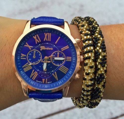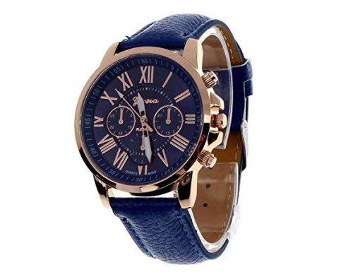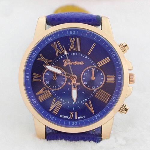A classic look, this fashionable Geneva roman numerals analog quartz wrist watch is designed with metal case and faux leather strap