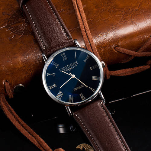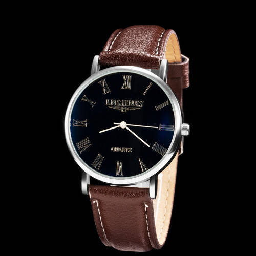 LUXURY LNGIINES FASHION BLACK FACE ROMAN NUMERAL QUARTZ WATCH WITH BROWN FAUX LEATHER BAND