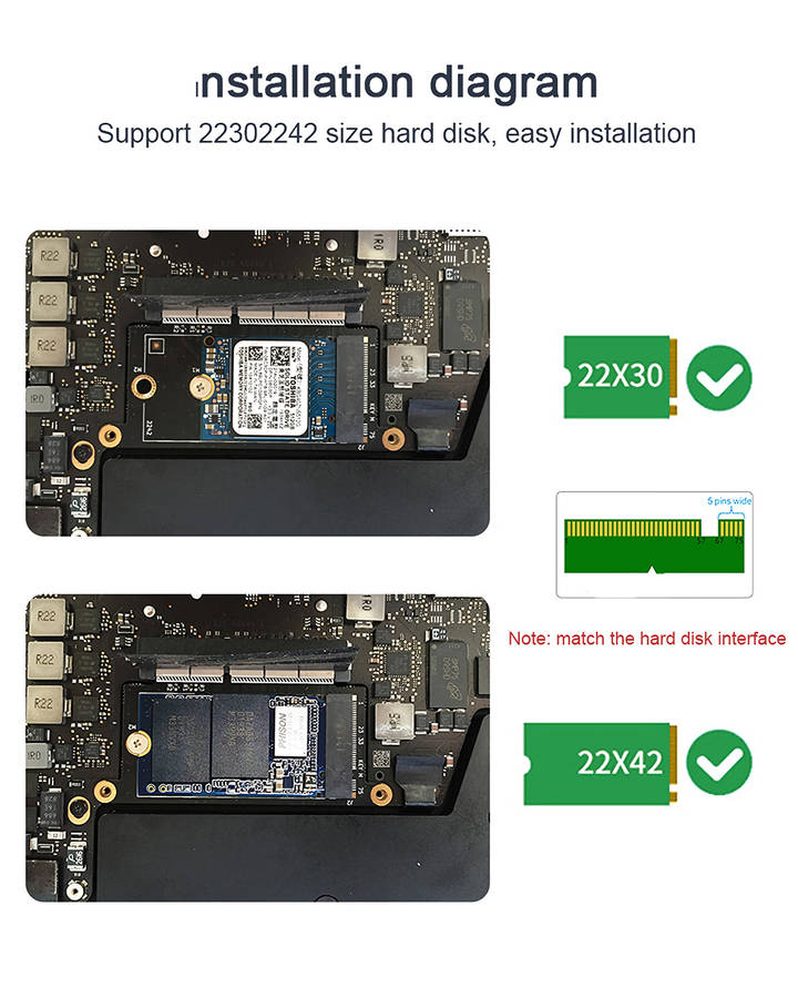 - Product Name: nvme SSD to Apple MacBook Pro A1708 adapter card - Supported hard disk size: 22302242 - Size: as the picture shown Notice: - Only 2230/22242 nvme m.2 ngff SSD hard disks are supported. - Only 2016 MacBook Pro A1708 and 2017 MacBook Pro A1708 laptops are supported! No other computer models can be used! - Only Mac OS Mojave, Catalina or higher Apple system is supported, and less than 10.14 version system is not supported. Because the nvme driver integrated by low version system can not identify most nvme SSDs on the market at present! - You need to install it through the U disk (make the apple tool for USB drive after 10.14 in advance) to identify the new hard disk. - Note: before disassembling the hard disk, disconnect the battery cable.