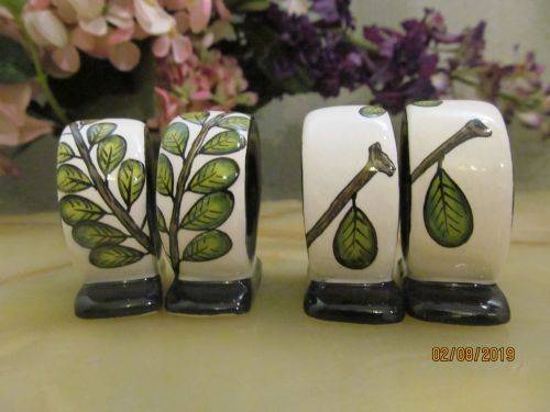 GUARANTEED TO BE EXCLUSIVELY UNIQUE DUE TO THEIR GORGEOUS HAND DECORATED NATURE, THIS LOT/SET CONSISTS OF FOUR LOVELY FINE PORCELAIN SERVIETTE RINGS, DECORATED WITH GLOSSY BLACK INTERIOR AND AN OUTER SURFACE WITH A SNOW WHITE BACKGROUND WHICH DEPICTS AN OLIVE GREEN LEAF AND BRANCH PATTERN