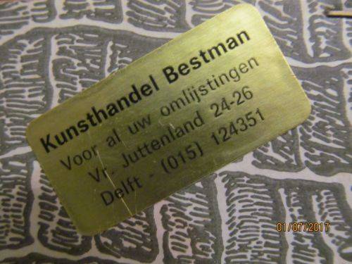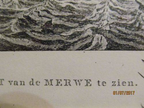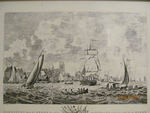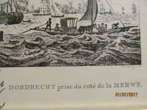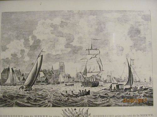 STAMPS/MARKS ETC : FIRSTLY THE PRINT IS TITLED -- "DORDRECHT VAN DE MERWE TE ZIEN, DORDRECHT PRISE DU COTE DE LA MERWE" This both Dutch and French DIRECTLY BELOW THE LITHOGRAPHIC PRINT IS ON THE LEFT - "D.DE JONG:AD VIVUM DELIN 1781" ON THE RIGHT IS -- "M SALLIETH SCULP" AT THE BACK IS A LABEL -- "KUNSTHANDEL BESTMAN, VOOR AL UW OMLIJSTINGEN, VR JUTTENLAND, DELFT "