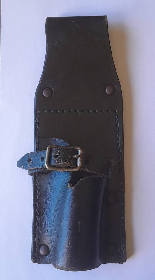 This is a leather bayonet frog used by South African forces in the late 1950s and early 1960's for their FN-FAL M1 assault rifle bayonets, especially shaped to allow for the flash hider prongs on the bayonet crossguard. Will also suit the No9 bayonet. In good, used condition with tight stitching and rivets,