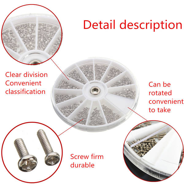 Description:M1/M1.2/M2 360pcs Glasses Clock Small Stainless Steel Screws 12 Specifications A box is divided into 12 lattice, let the screw how shaking will not on other