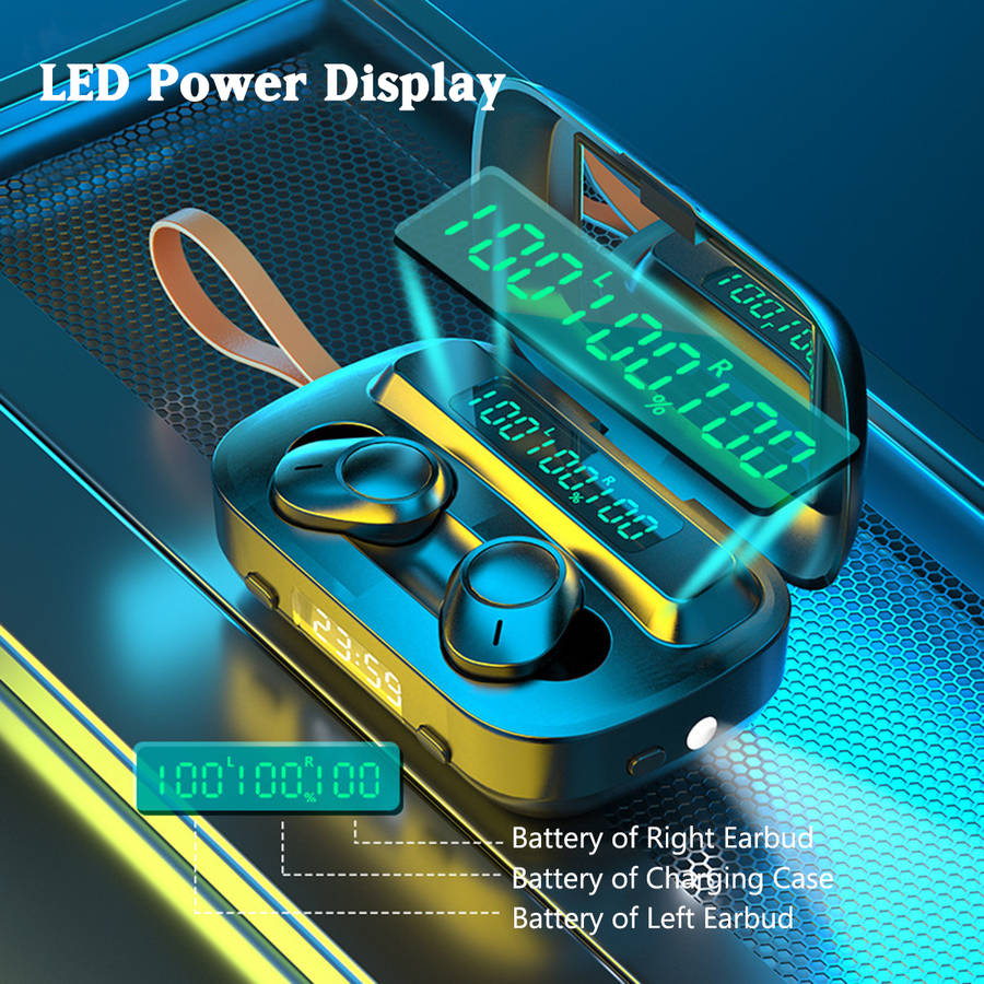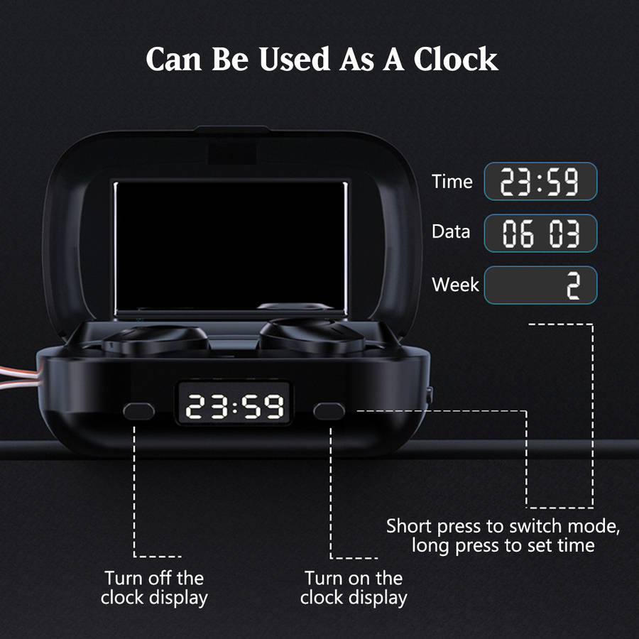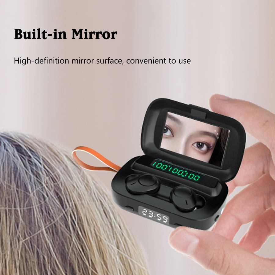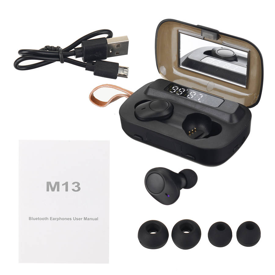 Specification: Product Name: bluetooth Earbuds Model: M13 Color: Black Size: 80x50x30mm / 3.14``x1.96``x1.18`` Material: ABS(Acrylonitrile Butadiene Styrene) bluetooth Version: bluetooth 5.0 Charging Case Battery Capacity: 2000mAh Earphone Battery Capacity: 50mAh Charge For Earphone: About 40 Times Music Time: About 180 Hours(with charging case) Call Time: About 220 Hours(with charging case) Feature: -LED power display, more intuitive to know the battery life. -bluetooth 5.0, more stable and faster connection. -IPX7 waterproof, no fear of rain and sweat. -Built-in mirror, you can make up anytime, anywhere. -Built-in flashlight, provide lighting at night. -Auto pairing, convenient to operate. Package Includes: 1 x Charging Case 2 x Earphones 1 x Charging Cable 2 x Pair of Eartips 1 x User Manual