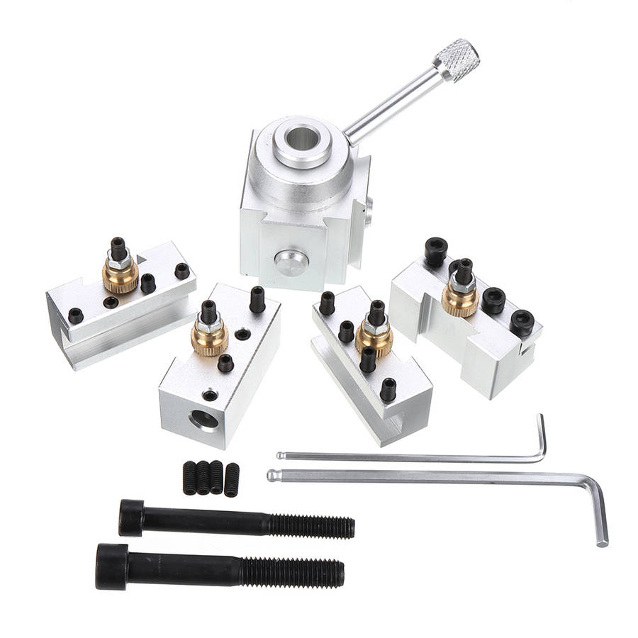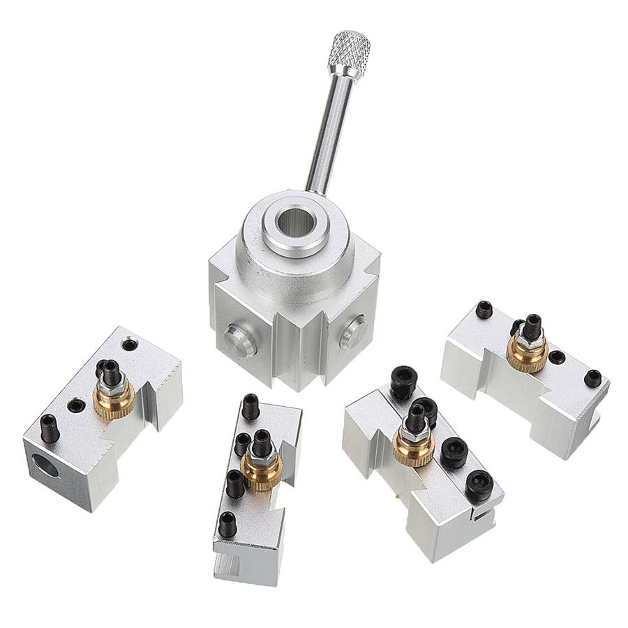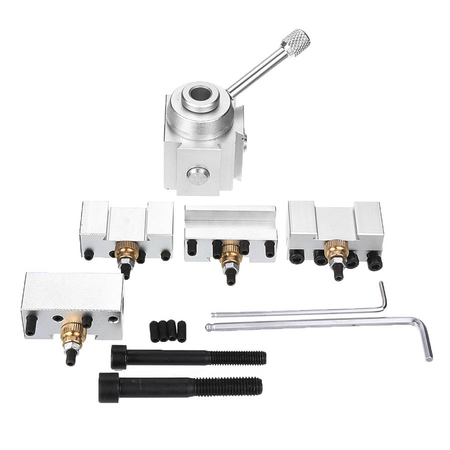 Silver Quick change tool boring bar turning tool post holderkit setfit for CNC mini lathe. Quick change tool post, cutter holder are major attachment of ordinary lathe, is composed of a tool post and several toolholder, according to the needs of machining, choose corresponding holder, can be carried out outside garden, surfacing, cut off, knurling, drilling, boring, reaming and other processing.