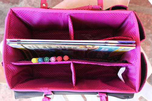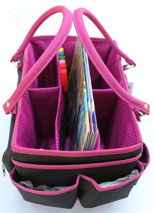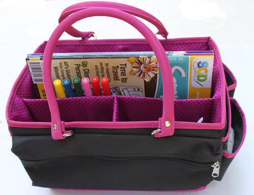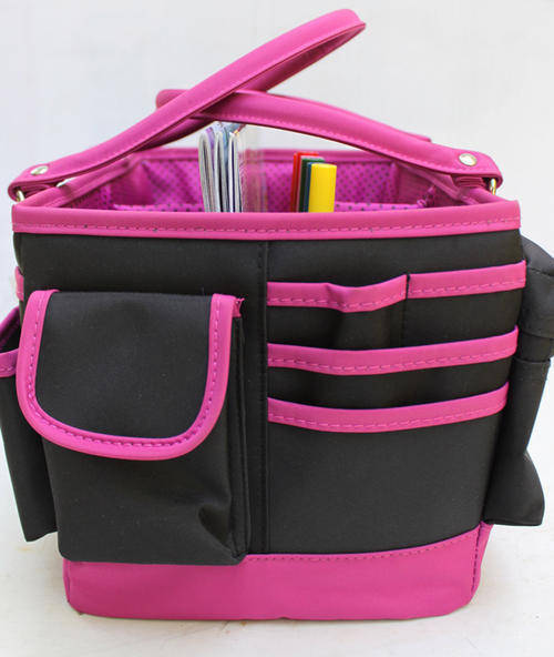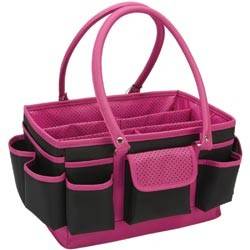 MACKINAC MOON-Open Top Craft Tote. Grab your scrapbooking stuff and go in style! This roomy organization caddy has all the storage you need to keep your supplies contained and within easy reach. The main compartment is fully lined and has five divided spaces-- four measure 6-2/1/2 inches and one measures 12x2 inches. There are also eighteen elastic band slots for holding pens and markers. The outside edges each have a variety of pockets and pouches for additional storage. There are eleven open pockets; one zippered pocket; and one pocket with a hook-and-loop tape closure. Two handles make carrying easy. Overall measurements are 14x10x8 inches. Each package contains one Open Top Craft Tote. Color: Black & Pink Dots.