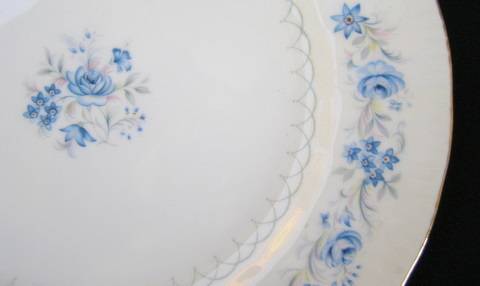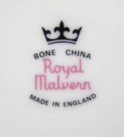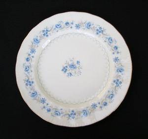 A Royal Malvern bone china plate decorated with a blue floral design. It is scalloped around the edge and trimmed around the rim with gold.