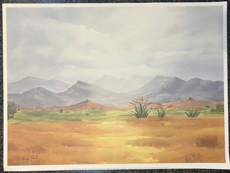 1 x COLLECTION OF 2 PRINTS "WHERE MEN STILL DREAM: A PORTFOLIO OF TWO REPRODUCTIONS FROM ORIGINAL WATERCOLOURS" BY LISTED SOUTH AFRICAN ARTIST ENSLIN VORSTER. IDEAL FOR COLLECTORS, INTERIOR DECORATORS. SUITABLE FOR FRAMING. IN ORIGINAL SLIPCASE IN EXCELLENT CONDITION. ALL PRINTS MEASURE: 61CM x 45CM
