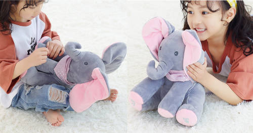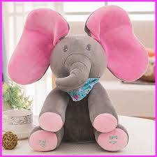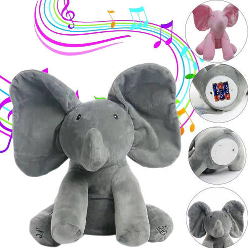Peek a Boo The Elephant — an adorable singing animated plush toy with two different play modes. Press the left foot to play an interactive game of peek-a-boo, and the right to hear the song "Do Your Ears Hang Low"; in a cute child’s voice. Ears move and flap during play. Surface-washable for easy cleaning. Appropriate for all ages.