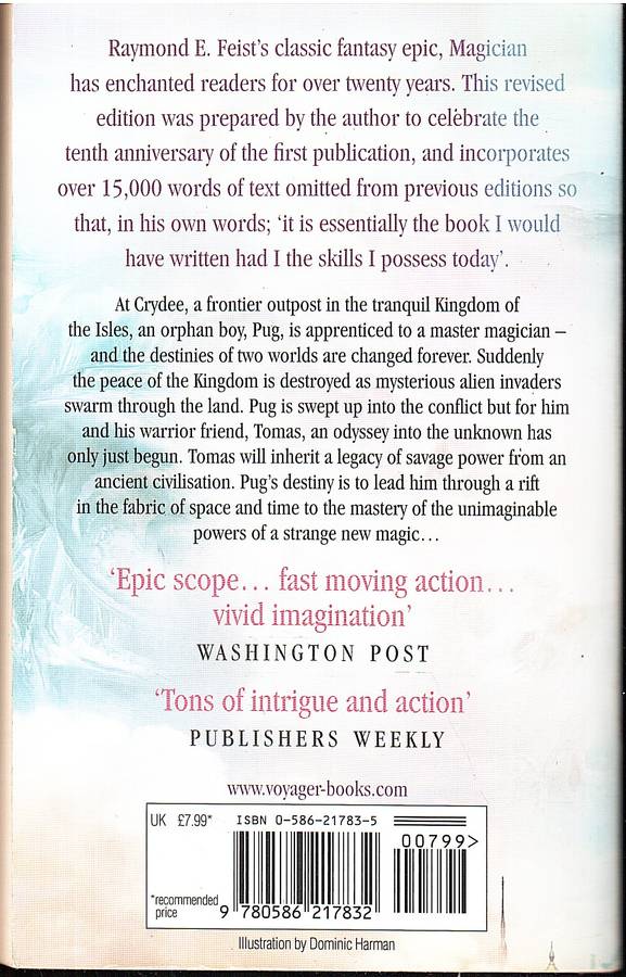 Raymond E. Feist's classic fantasy epic, Magician, has enchanted readers for over twenty years. The revised edition was prepared to celebrate the tenth anniversary of its publication, and incorporates over 15,000 words of text omitted from previous editions. At Crydee, a frontier outpost in the tranquil Kingdom of the Isles, an orphan boy, Pug, is apprenticed to a master magician -- and the destinies of two worlds are changed forever. Suddenly the peace of the Kingdom is destroyed as mysterious alien invaders swarm the land. Pug is swept up into the conflict but for him and his warrior friend, Tomas, an odyssey into the unknown has only just begun. Tomas will inherit a legacy of savage power from an ancient civilization. Pug's destiny is to lead him through a rift in the fabric of space and time to the mastery of the unimaginable powers of a strange new magic.
