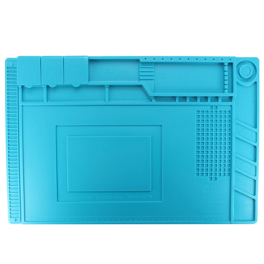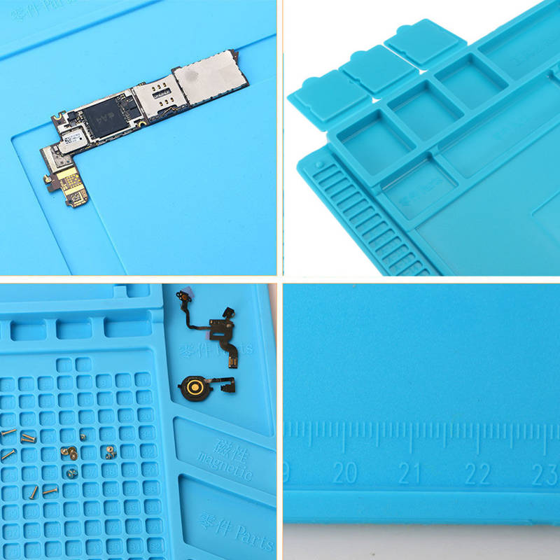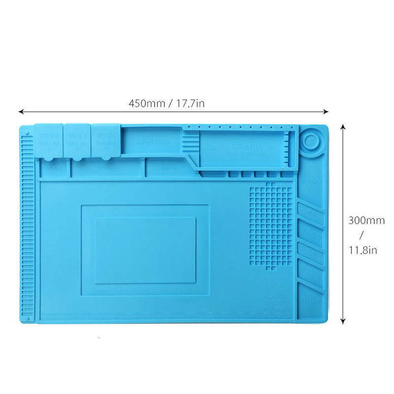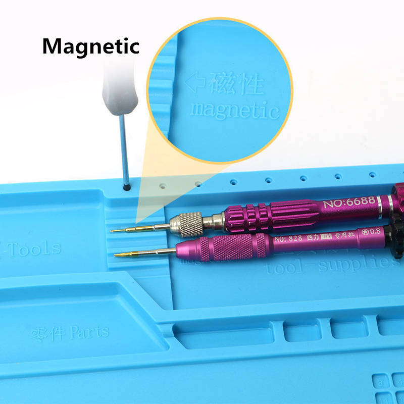 Feature: Resistance to high temperature of 500 ᆪC. Sevaral hole location to set screws,IC chips and small parts. Built-in scale ruler (0 ~ 36 cm ) on bottom section. Make your repair work easy. A good partner for hot air gun. Specification: Type: Heat insulation pad Size: 45 x 30 cm / 17.7 x 11.8 inch Thickness: about 5 mm Heat resistance: 500 ᆪC Material: Silicone Note:Only some small section is magnetic(marked on the pad), NOT so strong magnetic Package included: 1x Heat Insulation pad (Screwdrivers not included)