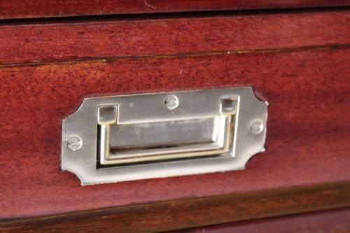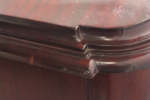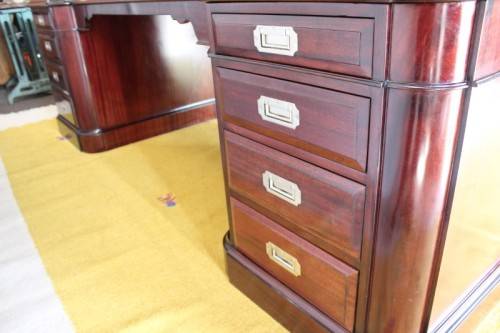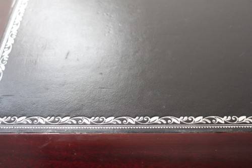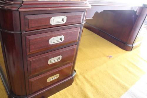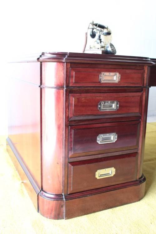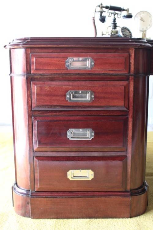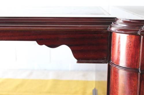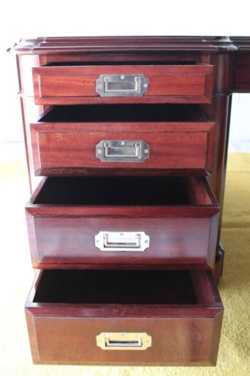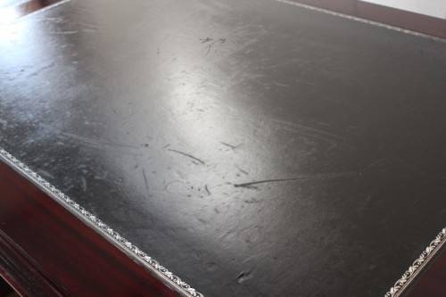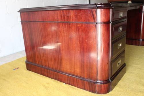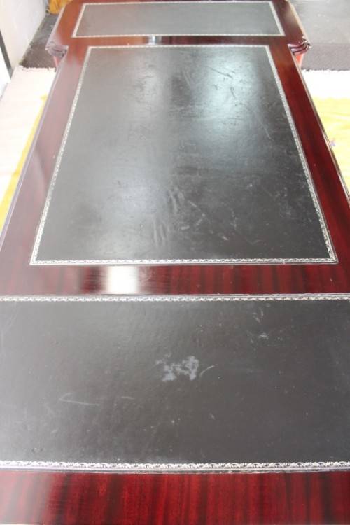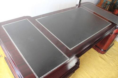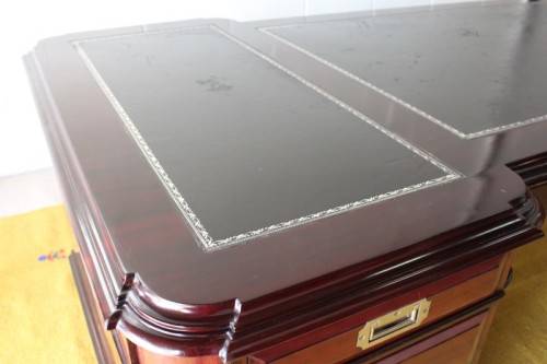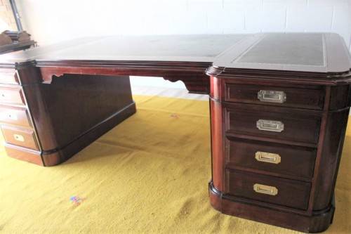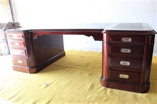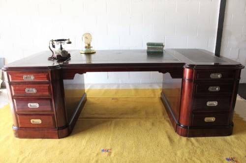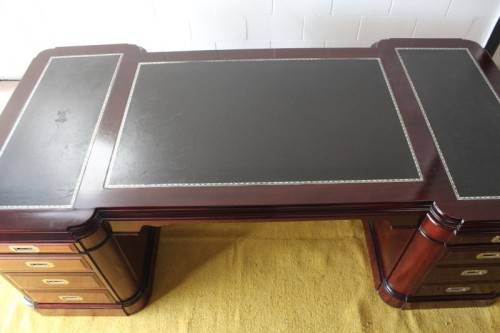 This magnificent vintage Regency-style black leather-top french-polished solid mahogany 16-drawer partners desk has beautiful brass handles on the drawers and is in great condition for its age. The oversized executives desk measures a superb 241cm long x 120m wide x 77cm high and is a true partners desk with the matching drawers on both sides of the desk; each pedestal has four drawers on either side. The leather top has silver embossed detailing around the edges and there are a few scuffs on the leather (see pics). The desk has normal age and usage related wear and tear and scuffs/ marks etc which one would expect to find on a vintage desk. The desk is a top-quality desk that came out of a home in Clifton. This is a beautiful desk that would look amazing in an executive's office with a Persian carpet and leather chairs, or in a home study to add that extra element of class and elegance. The desk can be separated into three sections for very easy transportation. Please view the pics carefully to fully appreciate this absolutely stunning executives desk and to confirm the condition. Please view the shipping options or request courier costs prior to purchasing any of our products.