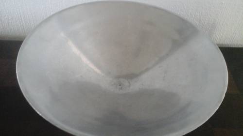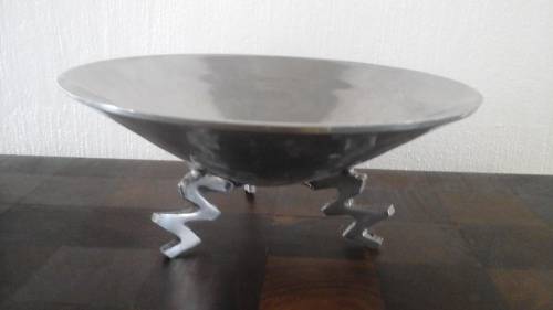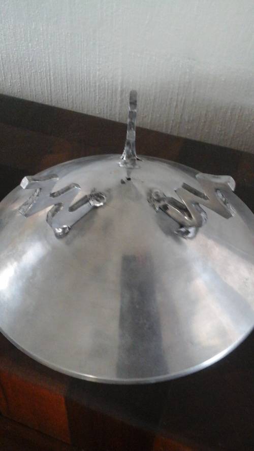 IT IS MADE FROM CAST ALUMINIUM, SHAPED TO LOOK LIKE A CONE AND IS HELD UP BY THREE ZIG ZAG SHAPED LEGS.