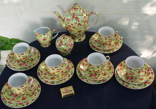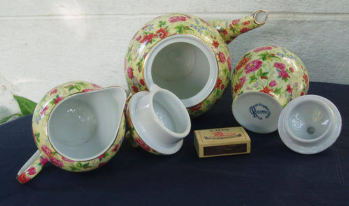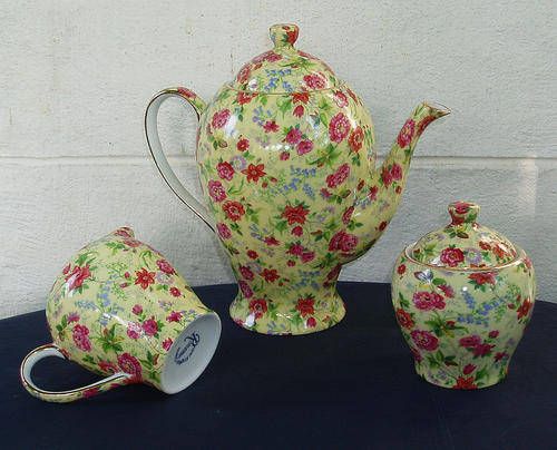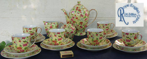 A TRULY MAGNIFICENT CONTEMPORY STYLE CHINTZ TEA SET, DECORATED IN CHARLOTTE DESIGN BY ROYAL ENGLISH CHINTZ, LIMITED EDITION. REAL CHINTZY TRANSFER PATTERN CRISP AND BRIGHT, AS NEW......PROBABLY NEVER USED. NOT SURE EXACTLY HOW OLD THIS SET IS, BUT IT IS SEVERAL YEARS OLD, SO NOT BRAND NEW. FREE OF ANY ISSUES......NO DAMAGES, CHIPS, CRACKS, SCUFFS, REPAIRS, NOT EVEN CRAZING, GILT TRIM PERFECT. BOTH LIDS INTACT. LARGE SIZE TEA POT MEASURES APPROXIMATELY 22CM HIGH AND 23CM SPOUT TO HANDLE EDGE, JUG IS ABOUT 9,5CM HIGH, TEA PLATE 17CM DIAMETER AND LARGE SIZE CUP IS ABOUT 7CM HIGH AND ABOUT 10,5CM RIM EDGE TO HANDLE EDGE.