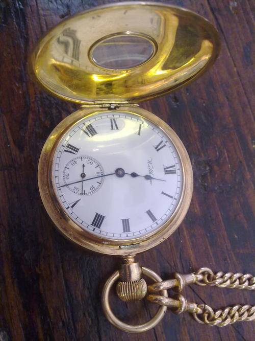 WOW! A 14ct solid gold Waltham pocket watch in its original box in 100% working order and just serviced. It also comes with a beautiful antique solid 14ct gold fob chain with 2 alberts and T bar. Each link is beautifully hallmarked 14ct gold. The length of the chain is 37cm and weighs a heavy 41.8 grams alone. The pocket watch on its own weighs 108.5grams so total is a whopping 150.3grams