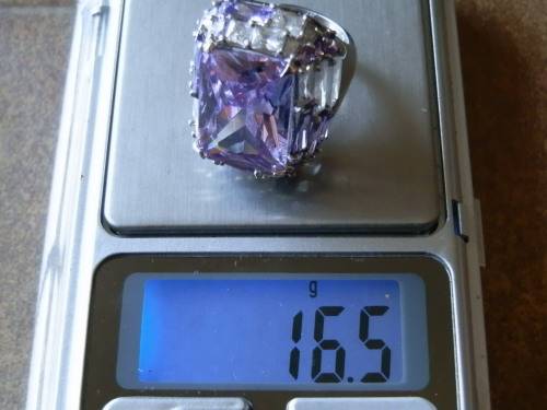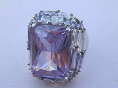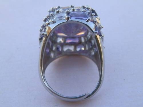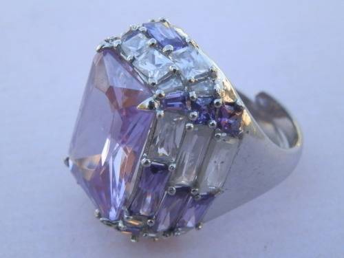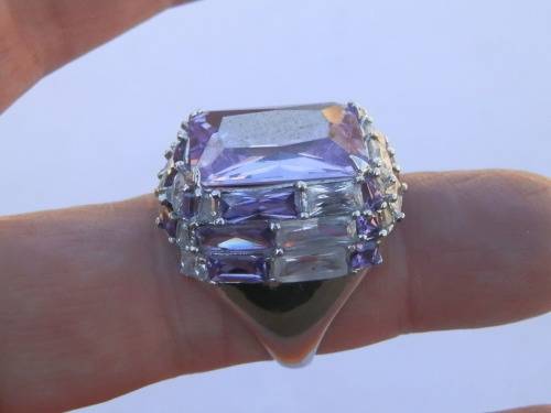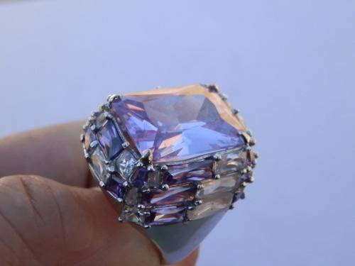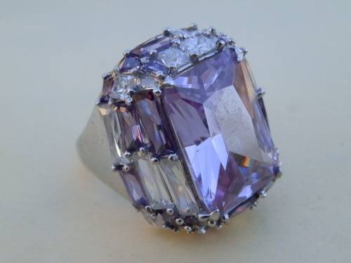 Fabulous sterling silver open ring with a purple stone and clear & purple stone accent, marked and in new condition. The size is P / 8, the top width is 25 mm and the weight is a whopping 16.5 g. Fantastic!!