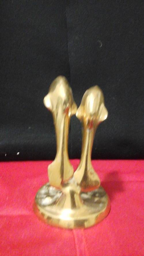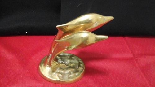 THIS GORGEOUS PIECE HAS AN OVAL BASE THAT SUPPORTS TWO STUNNING SWIMMING DOLPHINS. ONE DOLPHIN IS SLIGHTLY SMALLER THAN THE OTHER. THIS FANTASTIC PIECE IS WELL DETAILED.