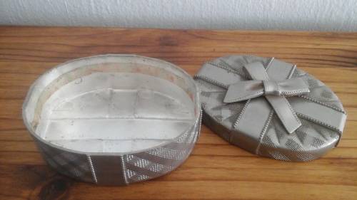 THIS STUNNING PIECE IS OVAL IN SHAPE AND LOOKS LIKE A PRESENT. IT HAS A REMOVABLE LID.