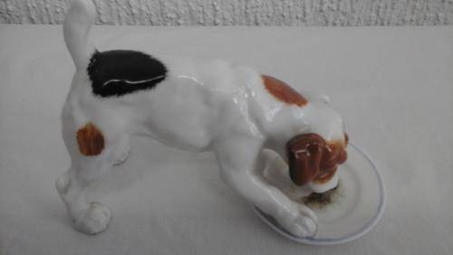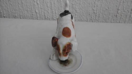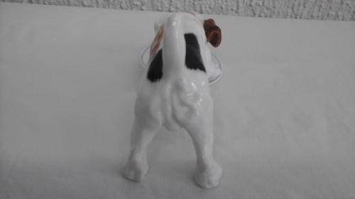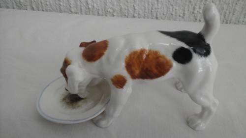 MAGNIFICENT VINTAGE ROYAL DOULTON FIGURINE OF PUPPY LICKING DISH. MADE IN ENGLAND. FROM THE CHARACTER COLLECTION H N 1158 BY CECIL ALDIN. MADE OF FINE BONE CHINA. IT IS SHAPED TO LOOK LIKE A JACK RUSSELL TERRIER WHO IS WHITE IN COLOUR WITH BLACK AND LIGHT BROWN SPOTS ALL OVER IT. HE IS BENDING DOWN AND TIPPING A BOWL OF FOOD, HIS PINK TONGUE IS VISIBLE. HE CAN BE DATED BACK TO APPROXIMATELY 1937 TO 1988. ON THE BOTTOM OF THE PLATE YOU CAN FIND THE "ROYAL DOULTON MADE IN ENGLAND H N. 1158" MARKING IN GREEN. THERE ARE NO CHIPS, CRACKS OR SCRATCHES. MANS BEST FRIEND SEEMS TO BE IN PREFECT CONDITION. IT MEASURES APPROXIMATELY 117 MM LONG, 50 MM WIDE AND 80 MM LONG. IT IS AN ABSOLUTELY ADORABLE COLLECTORS PIECE!