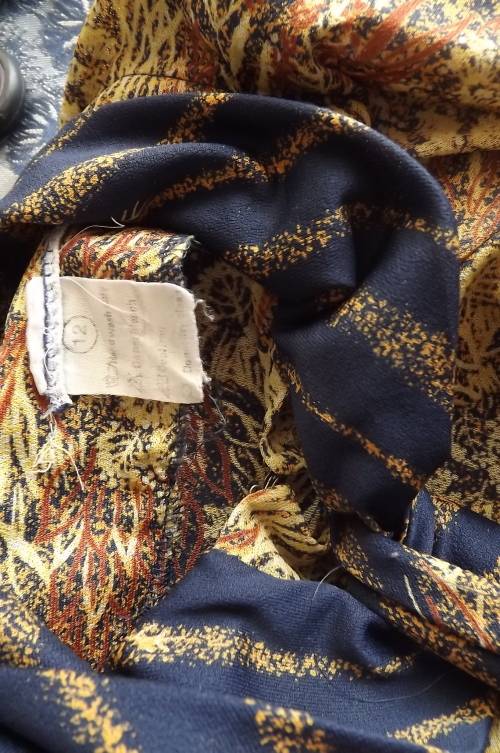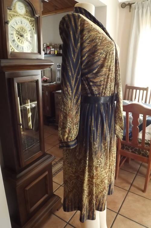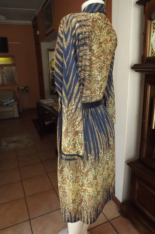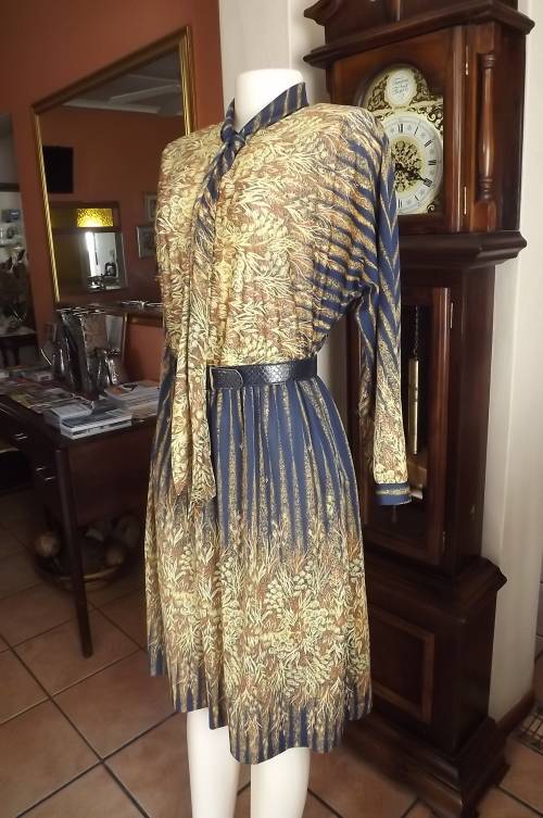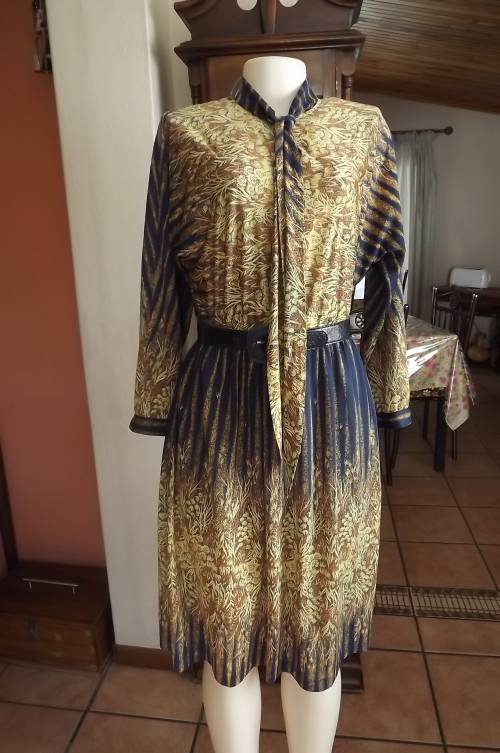Magnificient size 36/12 vintage dress with long cuffed kimono sleeves.Tie collar.opening on front.Amazing display in yellow,brick and navy blue colours.Elasticated middle.Navy belt included.