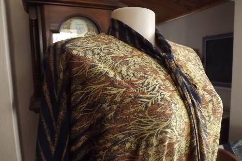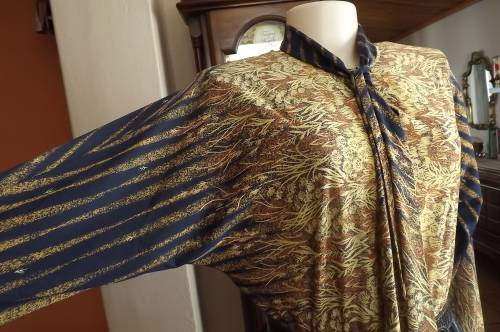 Magnificient size 36/12 vintage dress with long cuffed kimono sleeves.Tie collar.opening on front
