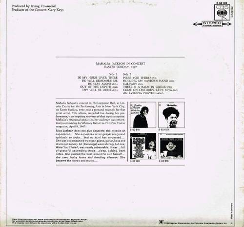 1967 German CBS pressing, release number S 63 102, of album by MAHALIA JACKSON: Mahalia Jackson in Concert - Easter Sunday, 1967. The track details are as shown on the images provided. The record has a few small, faint and ineffective sleeve-scratches & 1 scuff-line, otherwise in a hardly played, near excellent condition. The cover has scuffed corners and edges, lower right corner is creased, plus edge crinkles & ring-wear, otherwise still in a good plus shape. EX- / G |
