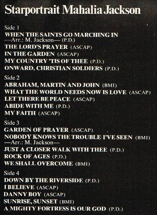 1972 Netherlands CBS pressing, release number 67 265, of gate-fold compilation double-album by MAHALIA JACKSON: Starportrait. The track details are as shown on the images provided. The records have a number of faint and ineffective sleeve-scratches & light scuff-lines, otherwise in a very good condition. The cover has scuffed corners and edges, a bumped lower left corner, partly weakened upper left & lower corners, a sticker discolouration at front upper right, some edge & surface crinkles, plus some light ring-wear, otherwise still in a reasonable good shape. VG/VG / G- |