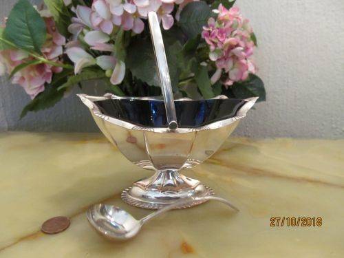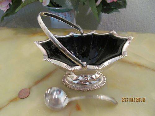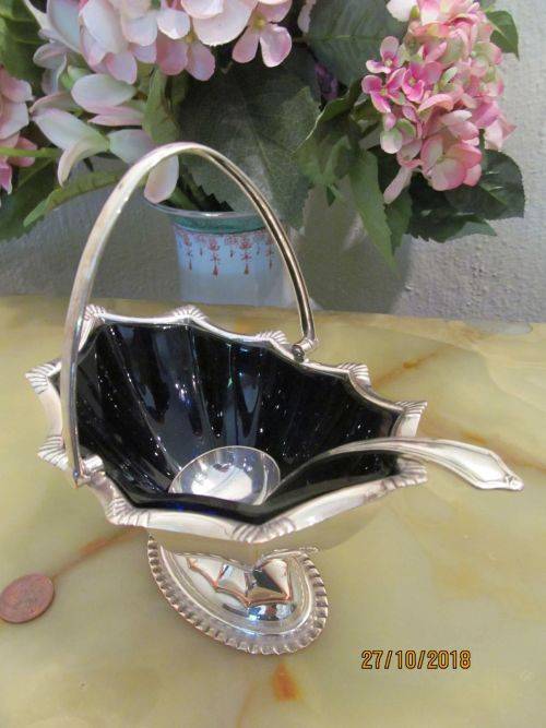 RARE ANTIQUE GEORGIAN ART DECO STYLE SILVER PLATED PEDESTAL SUGAR BASKET WITH COBALT GLASS INNER AND SILVER PLATED MAJESTIC LADLE