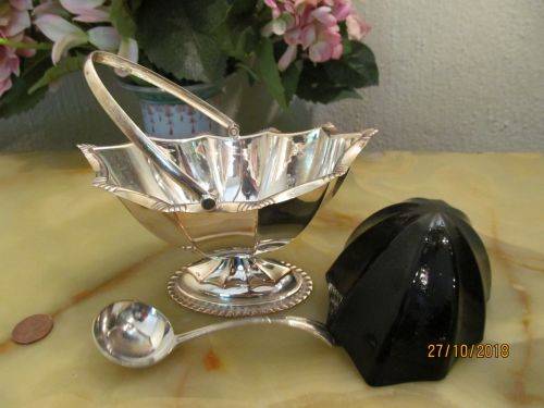 TOGETHER WITH THIS SUGAR BASKET IS A VINTAGE SILVER PLATED MAJESTIC LADLE WITH A ST. JAMES VERSION HANDLE PATTERN