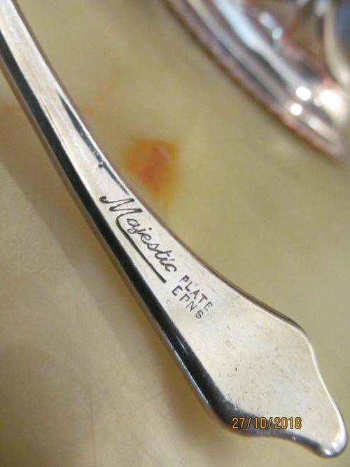STAMPS/MARKS ETC : THE BASKET/BOWL IS NOT STAMPED OR MARKED. THE LADLE IS HANDLE STAMPED - "MAJESTIC, PLATE EPNS"