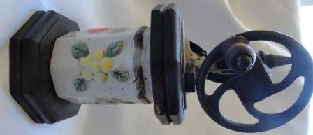 WITH metal mechanism, wooden base and unusual ceramic/porcelain surrounds with different designs.It is 22cm in height.