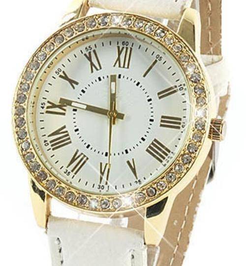 LADIES FASHION BLING CRYSTAL FAUX LEATHER STRAP GOLDEN CASE ANALOGUE QUARTZ WRIST WATCH WITH WHITE BAND AND WHITE FACE