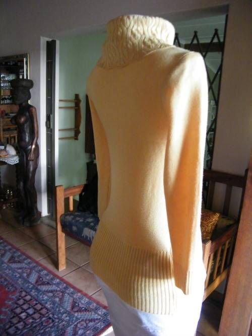 Make a statement in this buttercup yellow poloneck acrylic/cotton blend size 34/10.Knitted top.
