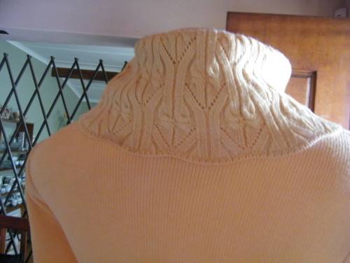 Make a statement in this buttercup yellow poloneck acrylic/cotton blend size 34/10.Knitted top.Beautiful pattern on front and collar with wide seam ribbing.Good condition.