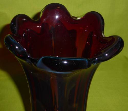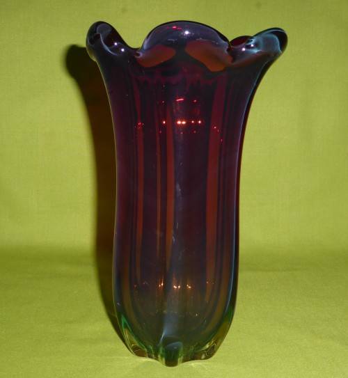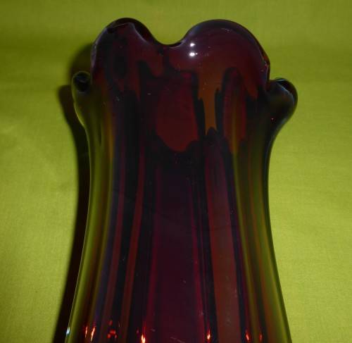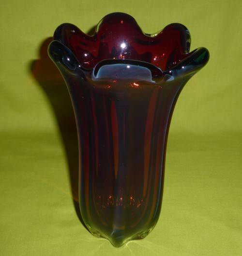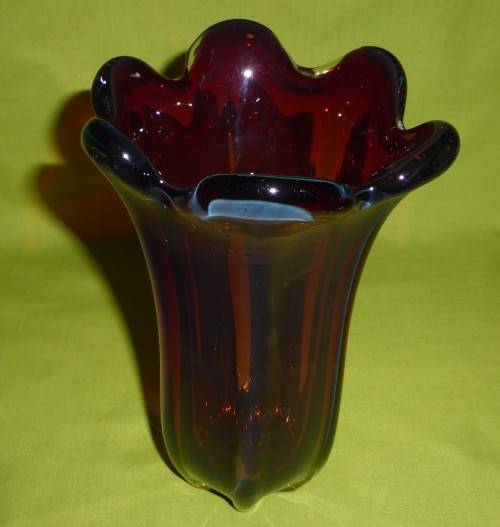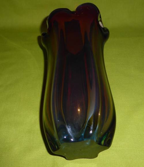 BARGAIN PRICE!!!!! The deep colours are soooooo gorgeous!!! But very difficult to photograph. It has a blue base, then amber above the base, then moving up to darker orange, then moving up to the majority deep red. The edges on top also have a dark blue/purple/grey colour. The vase needs to be moved around in sunlight to see the different colours. These photos appear very dark and do this magnificent piece no justice! Size is 13,5cm wide x 23,5cm high. It weighs 1,3kg's!!! It needs a good clean.... It is in excellent condition! With no chips or cracks.