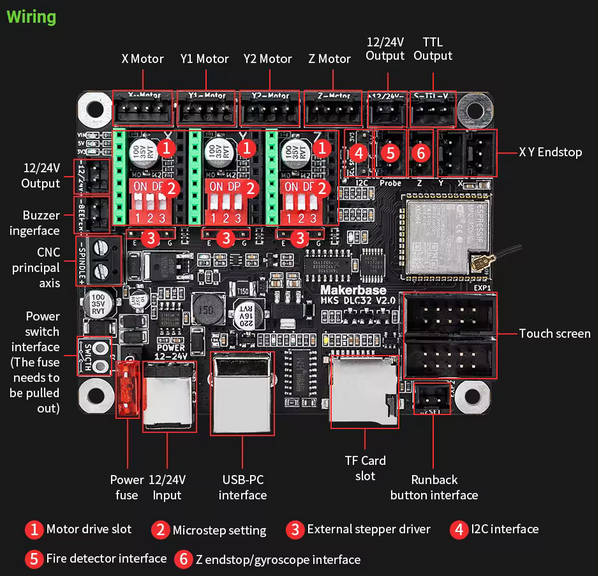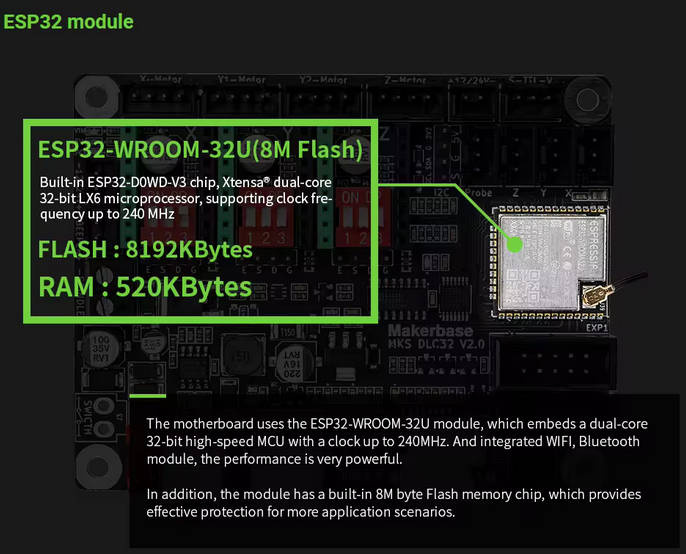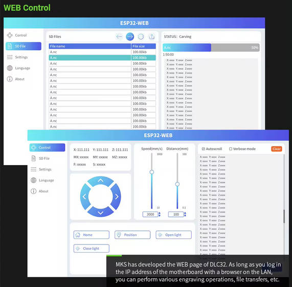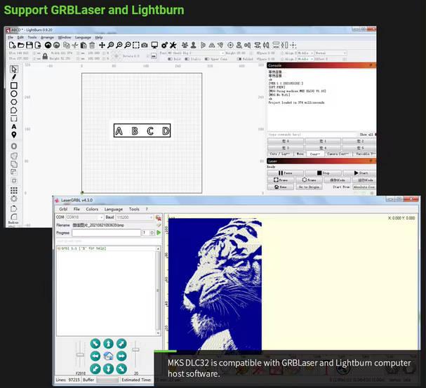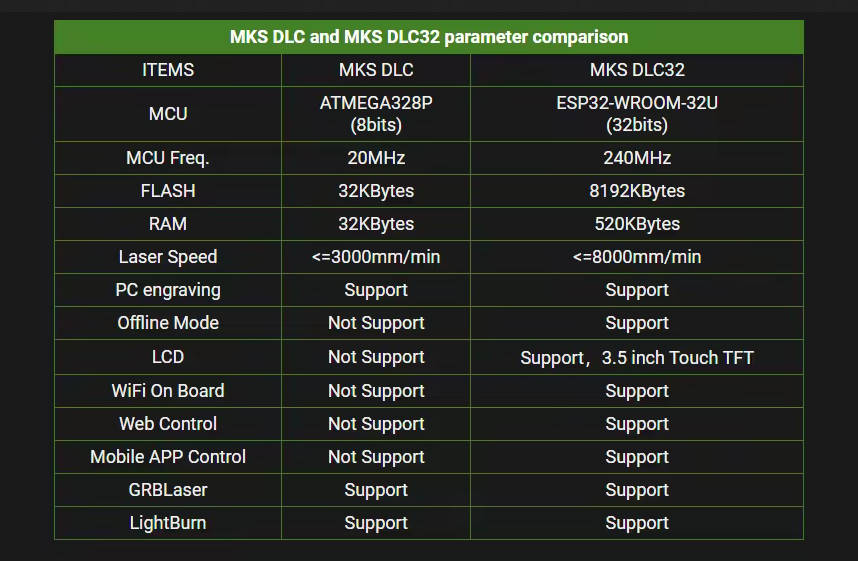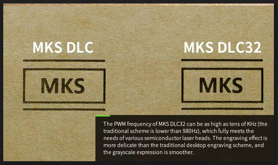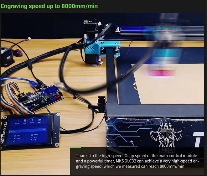 MKS DLC32 motherboard kit is an offline engraving master control kit developed for desktop engraving machines. The hardware is equipped with a 32-bit high-speed ESP32 module, integrated WIFl function, and directly drives a 2.4/3.5-inch touch color screen; it can realize fast engraving and web pages. Control, mobile phone APP control, and other functions. The mounting holes and board size of MKS DLC32 are compatible with MKS DLC, and it can also use with the GRBLaser and LightBurn PC software.