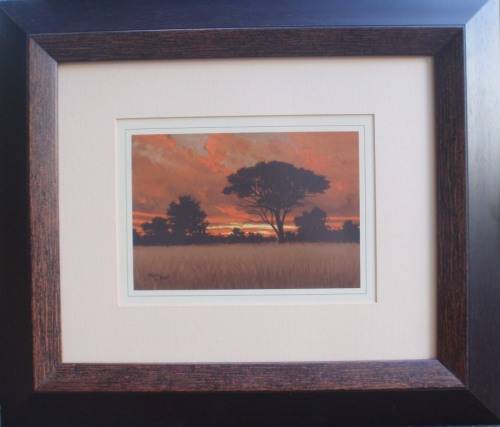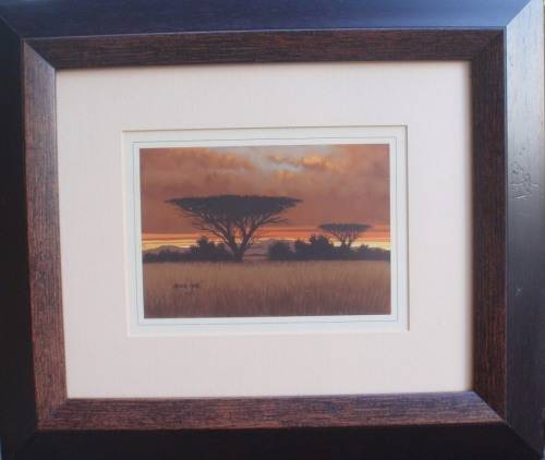 MALACHI SMITH - THE LATE MASTER ARTIST. A REALLY STUNNING PAIR OF AFRICAN LANDSCAPE PRINTS IN HANDSOME DARK WOOD FRAMES BEHIND NON-REFLECTIVE GLASS. IN GOOD, CLEAN CONDITION. SIZE: 45CM X 38CM EACH.