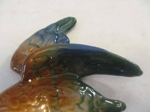 GLAZED IN A GLOSS FINISH, THE ITEM IS A VINTAGE 1950-1960's CERAMIC DECORATIVE WALL ORNAMENT DEPICTING A MALLARD IN FLIGHT. THE ITEM IS MARKED UNDERNEATH WITH AN EMBOSSED SYMBOL AS WELL AS MARKED WITH A NUMBER 501 WHICH LEADS ME TO BELIEVE THE ORNAMENT IS POSSIBLY A LEFTON CHINA MANUFACTURE
