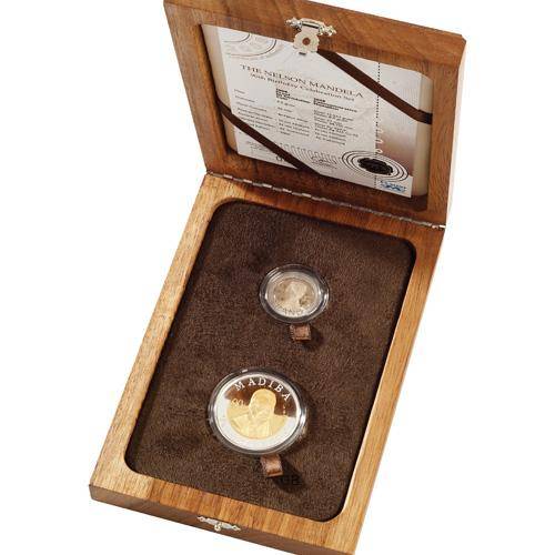 The coin and medallion are presented in a wooden box featuring an engraved image of Mr. Mandela on the lid. A numbered certificate of authenticity issued by the SA Mint certifies the product
