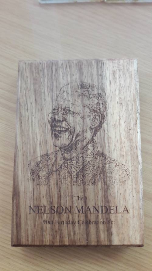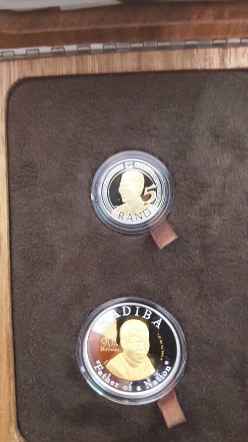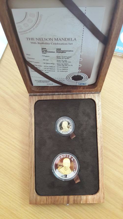 Mandela 90th Birthday celebration PROOF SET, Solid gold and silver Medal, and R5 PROOF as issued.