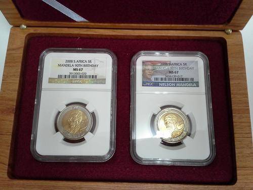 Mandela 90th Birthday Old and NEW label, both MS67 by NGC, display case not included.