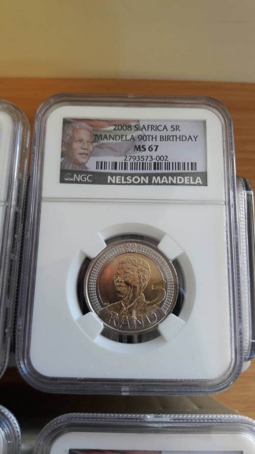 High Grade, MS67 NGC Graded NEW LABEL, Mandela 90th Birthday R5 coins, BID PER COIN. 50 x Available.