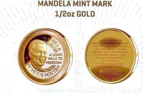 THE 1/2 0z MINT MARK FEATURES THE ICONIC BUST OF NELSON MANDELA ON THE OBSERVE OF THE MEDALLION WITH AN EXTRACT FROM HIS SPEECH IN THE 1963 TREASON TRIAL AND HIS SIGNATURE ON THE RESERVE.