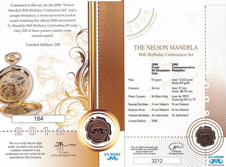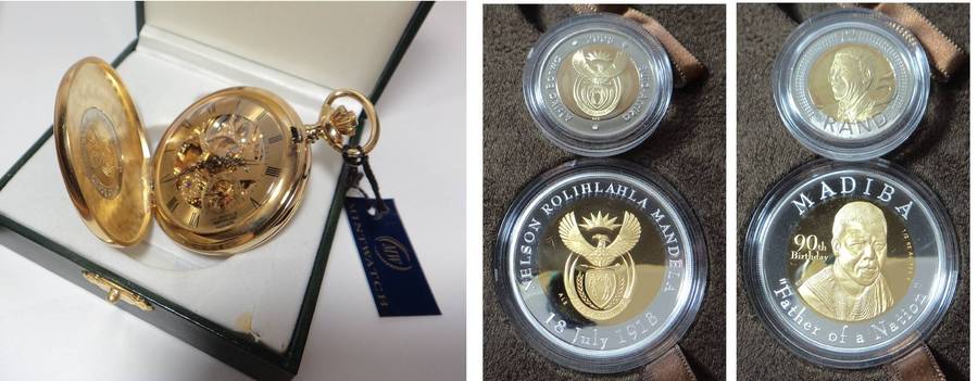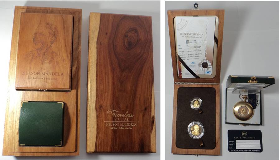 There is also a unique timepiece, a Swiss movement pocket watch featuring the official 2008 uncirculated Mandela 90th Birthday Celebration coin.