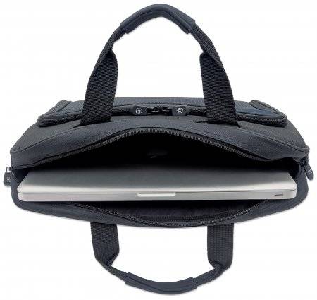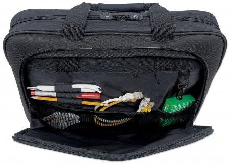 Its interior with padded computer compartment accommodates most notebook computers with widescreens up to 17.3". The top-load configuration enables quick packing and speedy airport inspections. Interior mesh pockets and pen loops keep the interior well organized. A rear slip strap conveniently secures a notebook computer and gear to an extended rolling bag handle.