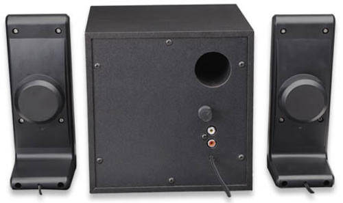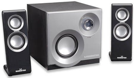 Maximize gaming, music and movie experiences with the Manhattan 3050 2.1 Speaker System. Designed to complement modern computers, displays and peripherals, its robust full-range speakers and front-firing subwoofer will draw listeners into the centre of the action. The subwoofer is crafted from wood products to help resonate full bass. This compact system makes an excellent computer speaker upgrade for use at home or the office without compromising too much valuable desktop or shelf space.