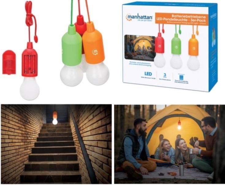 Manhattan Battery Powered Hanging LED Light - 3-Pack - For Indoor And Outdoor Use Without External Power Supply, Pull-Cord Design, Three-Piece Set With Red, Green And Orange Housings Retail Box 1 Year Warranty