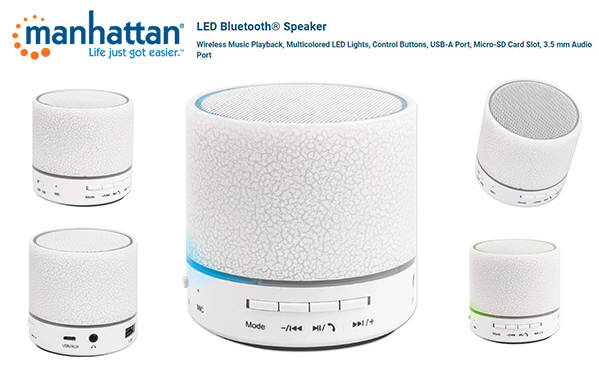 Manhattan LED Bluetooth Speaker - Wireless Music Playback, Multicolored LED Lights, Control Buttons, USB-A Port, Micro-SD Card Slot, 3.5 mm Audio Port, Retail Box , 1 year Limited Warranty