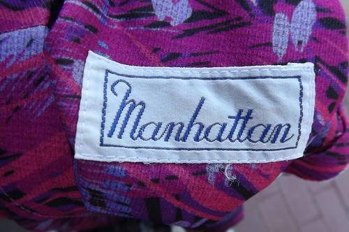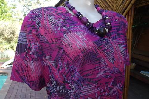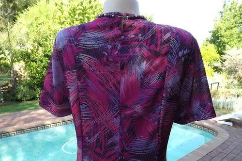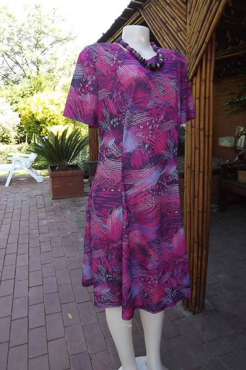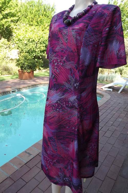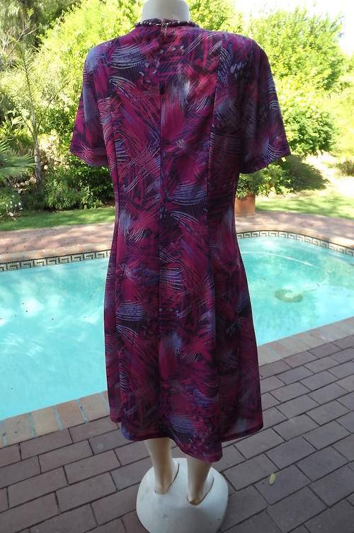 Vintage Manhattan Short Sleeve Polyester Wash & Wear Dress in size 16/40 in Purples & Blues Graphic Pattern - loose comfortable princess style with rounded neckline - good condition